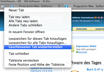 Undo Closed Tabs Button ist über ein kleines Pfeil-Symbol neben den so genannten Tabs erreichbar. Per Mausklick auf den Pfeil stellt man kürzlich aufgerufene und versehentlich geschlossene Registerkarten wieder her. Pro Sitzung holt das Programm bis zu 99 geschlossene Tabs in das Browser-Fenster zurück.